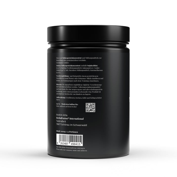 Molkenproteinkonzentrat (enthält Sojalecithin) (97,25 %), Xanthan (Verdickungsmittel), Kakaopulver, Cookie-Aroma (0,40 %), Salz, Sucralose (Süßungsmittel), Karamellaroma (0,10 %).